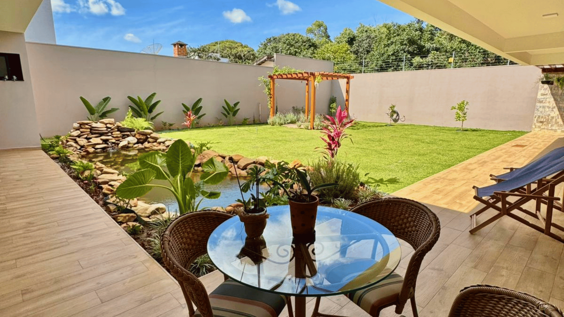 A cozinha planejada une praticidade e elegância, enquanto a área gourmet com churrasqueira é perfeita para receber. O amplo quintal com lago traz um toque especial de tranquilidade e conexão com a natureza.